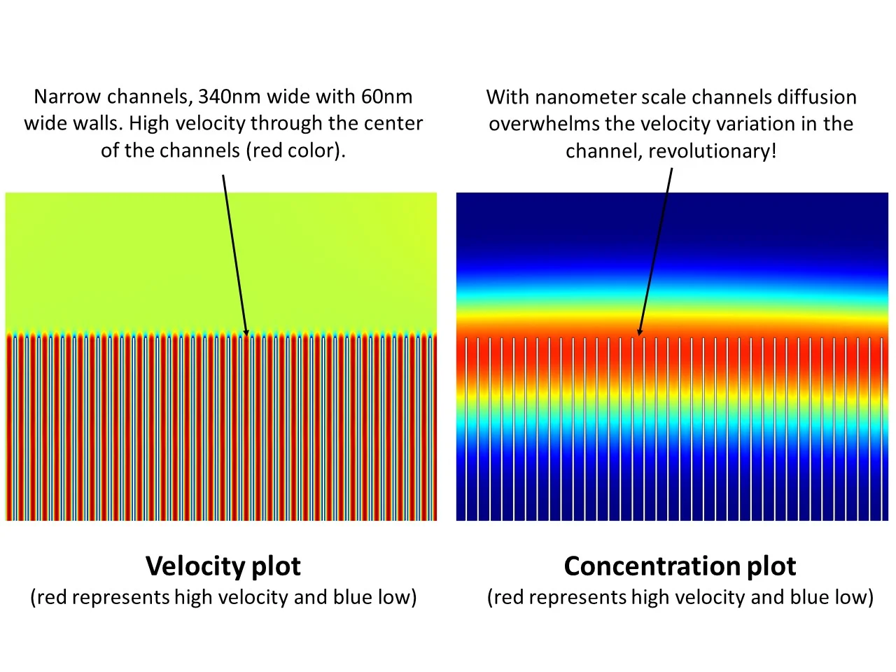 With much smaller channels the diffusion rate overwhelms the velocity of the fluid (The velocity is the same as the other examples)